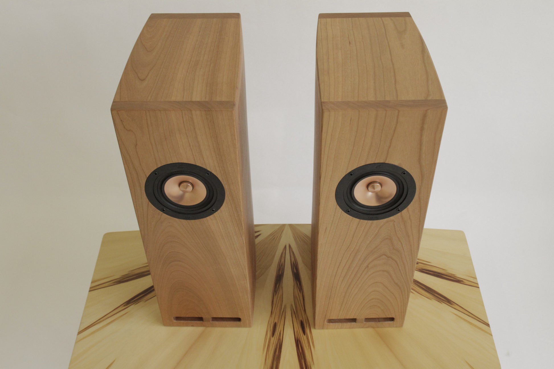 Pair of full range loudspeakers. The cabinets are constructed from Cherry timber and fitted with Markaudio CHR-70 drivers. Gold plated solid brass binding posts accept bare wire, banana plugs or spade terminals.